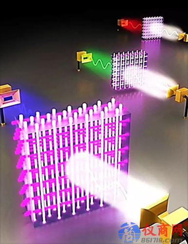 圖1 動態(tài)等離子體/金屬/介電晶體能夠過濾100~300 GHz范圍內(nèi)的電磁信號,并在任何給定的時間傳送所需的頻率;白光照射在晶體上象征著被晶體過濾的寬帶毫米波信號,其只允許窄帶輻射(以紅色、綠色或藍(lán)色的光束形式)穿過晶體