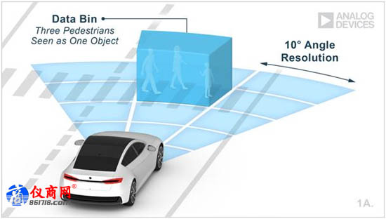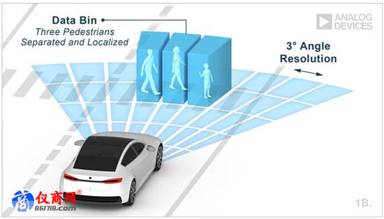 成像雷達(dá)的角度分辨率為1°至2°,是非成像雷達(dá)分辨率的10倍。數(shù)據(jù)“箱”收集1°到2°分辨率的信息,幫助區(qū)分和確定3名行人的位置 。