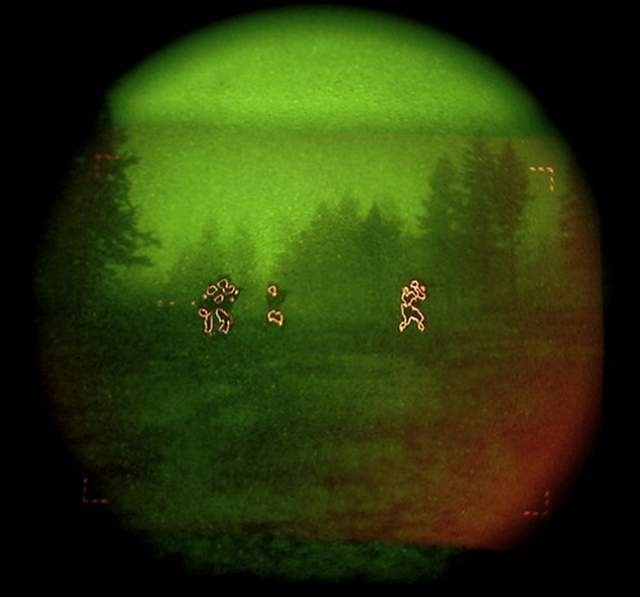 熱輪廓模式在任何釋放熱量的物體周圍產(chǎn)生一層薄薄的橙色輪廓線條,其余部分依然顯示微光夜視圖像。這種模式在使用紅外激光指示器時特別有用,因為使用者可以識別威脅,同時可以精確區(qū)分目標,尤其是當身邊也有戰(zhàn)友使用激光器照射目標時,可以互相明確各自瞄準的是哪一個。