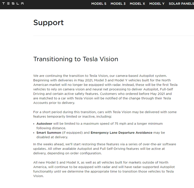 特斯拉在周二的聲明中也表示,過(guò)渡到以攝像頭為重點(diǎn)的系統(tǒng)可能會(huì)導(dǎo)致部分駕駛輔助功能受限,如車道居中和停車輔助。