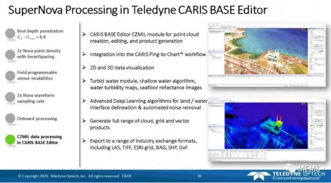 為了完善該水深激光雷達(dá)解決方案,Teledyne CARIS采用了base Editor軟件,實(shí)現(xiàn)無縫數(shù)據(jù)處理能力。CZMIL SuperNova測(cè)深解決方案利用人工智能(AI)技術(shù)進(jìn)行陸地/水域識(shí)別和噪聲分類,有效滿足市場(chǎng)對(duì)處理工作流程效率的要求。CARIS軟件工具為全方位的處理選項(xiàng)打開了大門:從數(shù)據(jù)轉(zhuǎn)換到全波形顯示和編輯,再到創(chuàng)建各種格式的增強(qiáng)信息產(chǎn)品。