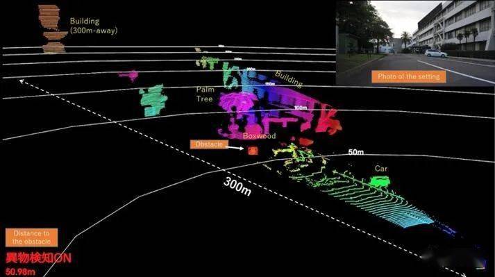 東芝新款激光雷達(dá)在室外陽光明媚的環(huán)境下,可以成功檢測放置在前方50米處的紙板,并精確地測量距離(1fps低幀速率、固定角度、探測范圍:~300 m)