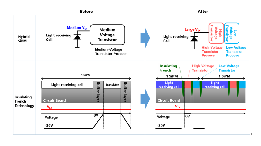 據(jù)悉,SiPM由一個光接收單元和控制光接收單元的多個晶體管電路組成。通過將晶體管電路的核心改為小型化的晶體管電路,SiPM的尺寸得以縮小。此外,東芝的技術(shù)人員在光電探測器和核心電路之間安裝了一個帶有高壓晶體管的高壓部件,以向光電探測器提供高電壓(VEX),這對提高SiPM的靈敏度非常重要。 不僅如此,技術(shù)人員還在在晶體管和光電檢測器單元之間放置了一個新開發(fā)的絕緣溝槽,那么以前需要保護(hù)晶體管而存在的寬緩沖層就可以省去了,進(jìn)一步實(shí)現(xiàn)了小型化的目標(biāo)。