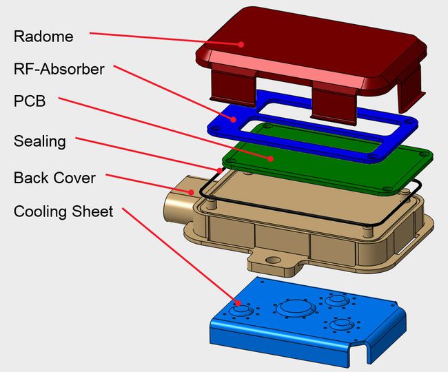 朗盛新概念包括以下單個組件:前蓋(天線罩);雷達吸波器;印刷電路板(PCB),包括天線;和帶有集成冷卻元件的后蓋。天線罩由塑料制成,背對車輛,可高度傳輸雷達波。而聚對苯二甲酸丁二醇酯(PBT)具有較低的介電常數(shù)(Dk)和損耗因子(Df),因此非常適合這種應(yīng)用。