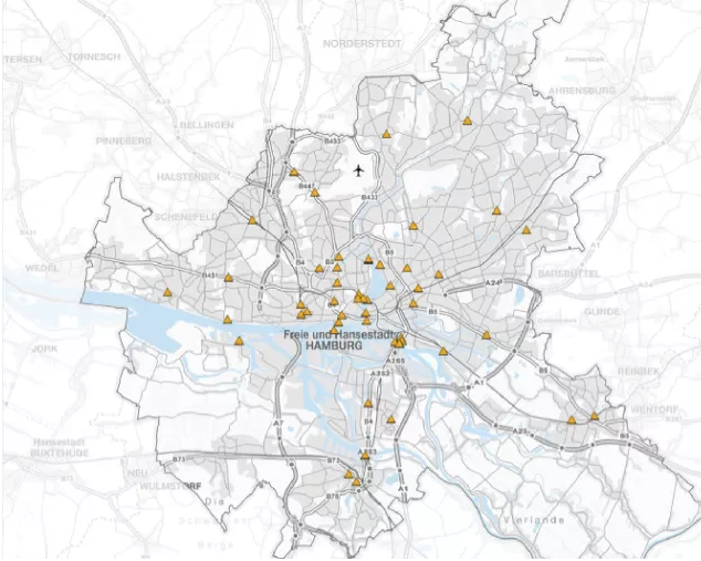 漢堡城市道路網(wǎng)絡(luò)中計(jì)數(shù)點(diǎn)在位置上經(jīng)科學(xué)研究,能幫助有關(guān)部門調(diào)查天氣、公共假期、重大活動、建筑工地、交通分流等因素對自行車流量的影響。