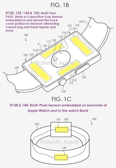 在蘋果公司的專利圖 1B 和 1C 中,可穿戴設(shè)備(#100:Apple Watch)中傳感器系統(tǒng)可能包括多像素 PVDF、應(yīng)變或電容式間隙傳感器#130、#132、#134 和 #136,嵌入后蓋#114 或周圍(例如,在第二個后蓋部分#114-2 周圍),以測量交流(AC)肺和心臟信號。