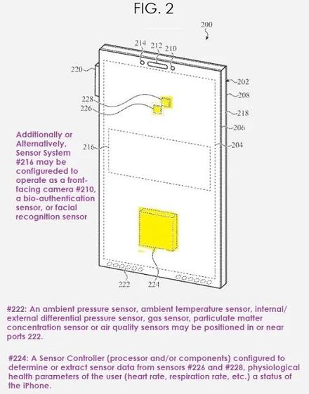 蘋果的專利圖 2 說明了 iPhone 的透視前視圖,該 iPhone 具有用于確定用戶健康參數(shù)和替代生物認(rèn)證傳感器的傳感器。據(jù)蘋果公司稱,這些傳感器也可以應(yīng)用于家庭門鎖、恒溫器、冰箱或其他家用電器、車輛導(dǎo)航系統(tǒng)、機器人導(dǎo)航系統(tǒng)、iPad 等。