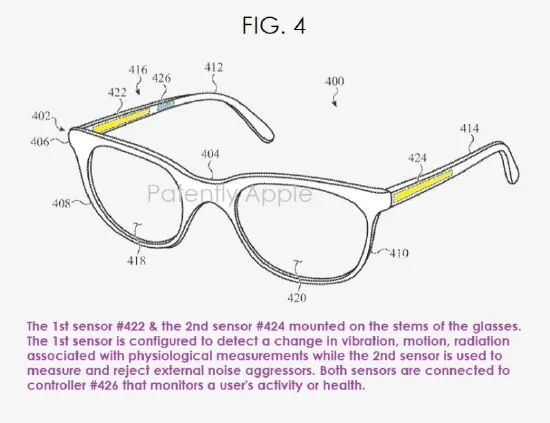 蘋果的專利圖 4 說明了另一個可穿戴設(shè)備#400 的透視前視圖,該示例具有用于確定可穿戴設(shè)備#400 用戶健康參數(shù)的傳感器??纱┐髟O(shè)備#400 可以是一副眼鏡、智能眼鏡等。
