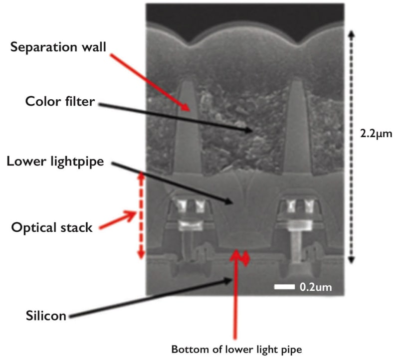 在這個(gè)結(jié)構(gòu)的基礎(chǔ)上,憑借像素頂部的開(kāi)拓性光學(xué)堆棧結(jié)構(gòu),Topaz 2M傳感器和Optimom 2M模組具有更高的靈敏度。像素通過(guò)無(wú)間隙頂部透鏡優(yōu)化像素間距,以避免光損失和不必要的反射,但真正的創(chuàng)新在于這種“雙光管”架構(gòu),該架構(gòu)通過(guò)在傳感器的光學(xué)堆棧中創(chuàng)建的微光纖(不同反射率的材料)將光直接引導(dǎo)到光電二極管上。