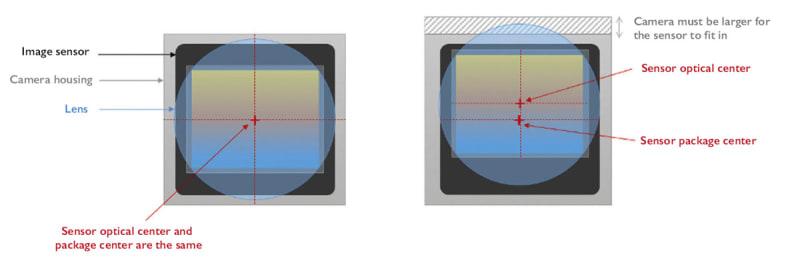 除了封裝技術(shù)之外,待封裝的傳感器裸片的設(shè)計(jì)也會(huì)對(duì)最終系統(tǒng)的尺寸產(chǎn)生影響。圖像傳感器制造商可用的關(guān)鍵技巧之一是將封裝中心與光學(xué)中心匹配到完全相同的位置,以此來(lái)盡量減少最終的系統(tǒng)外殼尺寸。圖5說(shuō)明了光學(xué)中心和封裝中心不匹配的影響,今天在一些圖像傳感器中仍然可以看到這種情況。