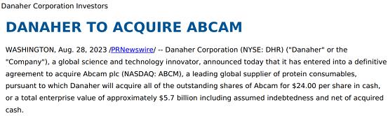8月28日,丹納赫集團(tuán)宣布,與全球領(lǐng)先的蛋白質(zhì)耗材供應(yīng)商Abcam plc(NASDAQ:ABCM)達(dá)成協(xié)議,將以每股24.00美元的現(xiàn)金收購Abcam的所有流通股。