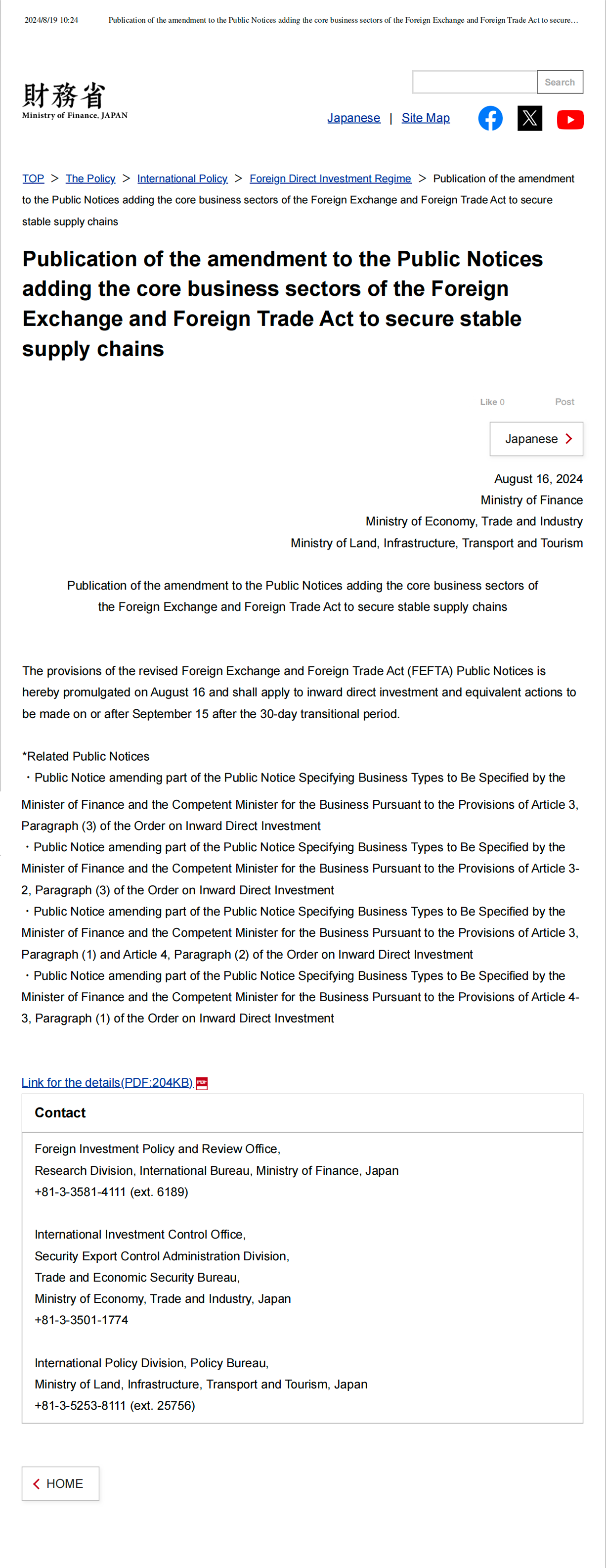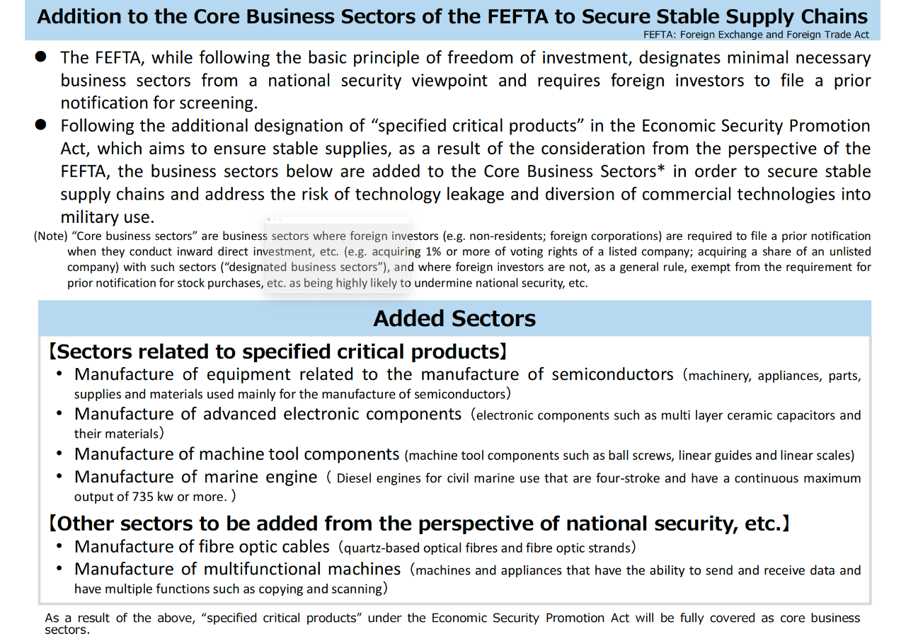 日本財務(wù)省(即財政部)發(fā)布公告稱,作為確保穩(wěn)定供應(yīng)鏈的努力的一部分,日本已經(jīng)修訂《外匯外貿(mào)法》,增加了保護(hù)半導(dǎo)體設(shè)備等核心產(chǎn)業(yè)的實施外資投資監(jiān)管。該規(guī)定將適用于9月15日之后進(jìn)行的直接投資等或特定收購。