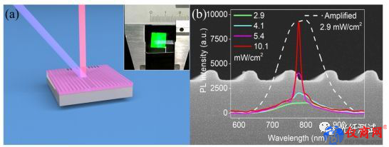 (a) DFB全硅激光器的光泵浦和發(fā)光示意圖;插圖:DFB激光器件的實(shí)物照片。(b)樣品的PL譜隨泵浦功率的變化;背景:DFB結(jié)構(gòu)的橫截面SEM圖像。