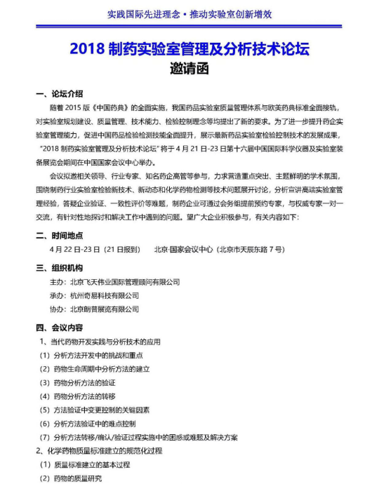 第十六屆中國國際科學儀器及實驗室裝備展覽會(CISILE2018)將于2018年4月21-23日在北京·國家會議中心召開。近日,CISILE2018新增一項同期活動——2018制藥實驗室管理及分析技術(shù)論壇,制藥相關(guān)的小伙伴可以關(guān)注一下喲!