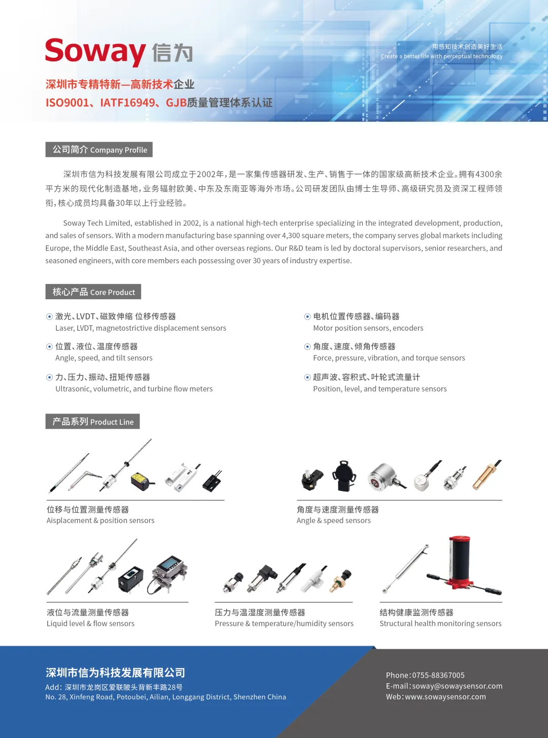 信為科技自2002年成立以來,一直致力于傳感器領(lǐng)域,為客戶提供定制化的傳感器應(yīng)用解決方案。2007年引進(jìn)美國先進(jìn)技術(shù)并結(jié)合市場需求,開發(fā)了多種滿足高端市場需求的傳感器產(chǎn)品,擁有40余項(xiàng)實(shí)用新型專利及發(fā)明專利,并通過IATF16949汽車質(zhì)量管理體系認(rèn)證。