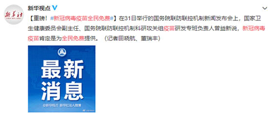 2020年的最后一天,萬(wàn)眾期待的好消息傳來——國(guó)產(chǎn)首款新冠疫苗終于上市!在舉行的國(guó)務(wù)院聯(lián)防聯(lián)控機(jī)制新聞發(fā)布會(huì)上,國(guó)家衛(wèi)生健康委員會(huì)副主任、國(guó)務(wù)院聯(lián)防聯(lián)控機(jī)制科研攻關(guān)組疫苗研發(fā)專班負(fù)責(zé)人曾益新說,新冠病毒疫苗肯定是為全民免費(fèi)提供。