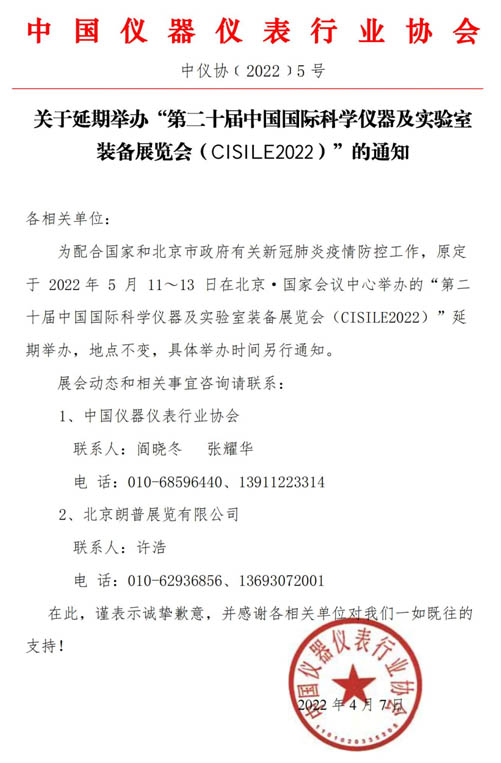 為配合國(guó)家和北京市政府有關(guān)新冠肺炎疫情防控工作,原定于 2022年 5 月 11~13 日在北京?國(guó)家會(huì)議中心舉辦的“第二十屆中國(guó)國(guó)際科學(xué)儀器及實(shí)驗(yàn)室裝備展覽會(huì)(CISILE2022)”延期舉辦,地點(diǎn)不變,具體舉辦時(shí)間另行通知。