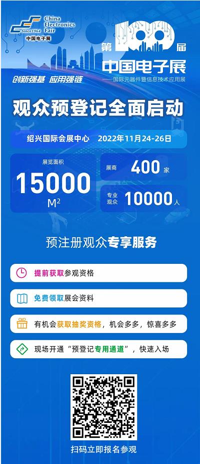 2022年11月24日-26日,第100屆中國電子展——國際元器件暨信息技術(shù)應(yīng)用展將于紹興國際會展中心舉行,攜手電子行業(yè)領(lǐng)域代表企業(yè),共同勾畫“創(chuàng)新強基 應(yīng)用強鏈”的電子信息產(chǎn)業(yè)藍圖。