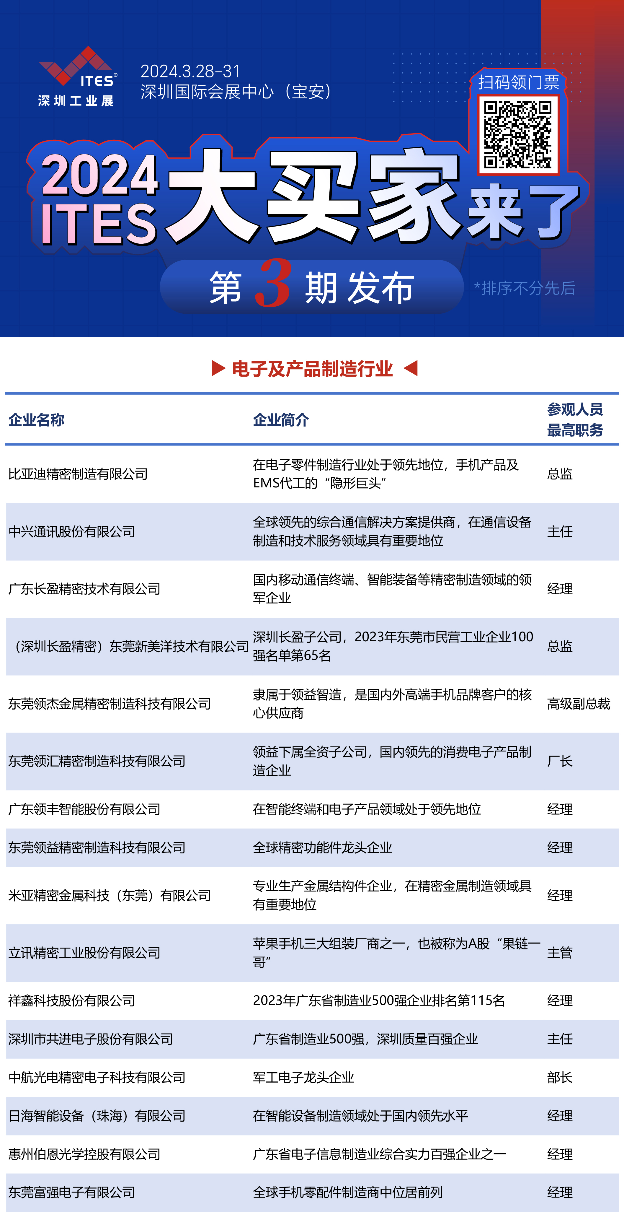 參展商已整裝待發(fā),產(chǎn)業(yè)鏈的雙向奔赴怎能少了買家企業(yè)?截至目前,來自電子及產(chǎn)品制造、新能源技術(shù)、家電廚衛(wèi)、金屬及塑膠制品、模具及模具配件、汽車/摩托車整車及配件、醫(yī)療器械、精密制造等行業(yè)的1000+家明星終端制造企業(yè),以及商協(xié)會,已成功報名并確認(rèn)到場參觀2024 ITES深圳工業(yè)展。