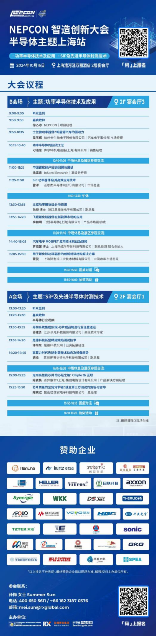 明日舉辦!1016日“NEPCON 智造創(chuàng)新大會(huì) —— 半導(dǎo)體主題上海站”將于上海漕河涇萬(wàn)麗酒店舉辦。長(zhǎng)電、士蘭微、派恩杰、晶能微、飛锃半導(dǎo)體、功成半導(dǎo)體、奇異摩爾、芯信安、InSemi Research、庫(kù)爾特、是德科技、伊賽侖特、賀利氏等將蒞臨分享功率半導(dǎo)體技術(shù)及應(yīng)用、SiP及先進(jìn)半導(dǎo)體封測(cè)技術(shù)。超30家半導(dǎo)體封測(cè)制程中的企業(yè)展示創(chuàng)新解決方案,精彩日程搶先看!