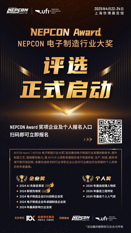 本次評(píng)選的報(bào)名時(shí)間定于1月15日至3月31日,網(wǎng)上投票時(shí)間將于4月1日至4月18日開展,頒獎(jiǎng)儀式則定于NEPCON China 2025年4月22-24日在上海世博展覽館同期舉行,期待參與。