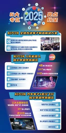 本屆展會創(chuàng)新打造六大特色細(xì)分專區(qū),NEPCON全球先進(jìn)電子制造解決方案、NEPCON人形機(jī)器人核心零部件拆解區(qū)、NEPCON汽車電子&低空飛行核心零部件拆解區(qū)、ICPF半導(dǎo)體封測技術(shù)、中國靜電防護(hù)產(chǎn)業(yè)展及電子潔凈專區(qū)、自動化及智慧工廠,滿足不同行業(yè)觀眾的尋新品、探趨勢、拓人脈的商務(wù)需求,打造一場精彩絕倫的電子制造科技盛會。