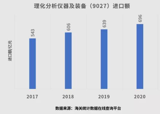 近幾年來,隨著我國產(chǎn)業(yè)升級速度的加快,各行各業(yè)對于高端分析儀器的需求亦不斷增長。我們僅以理化分析儀器及裝備(包含質(zhì)譜)的進口額為例,從2017年到2021年,我國每年的進口額都在600億元左右,而且逐年穩(wěn)步增長,即便是疫情期間也絲毫未受影響。