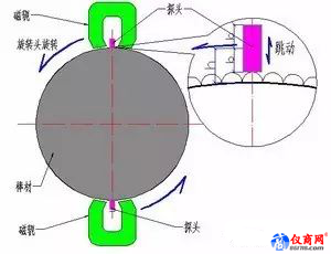 鋼棒漏磁檢測方式如圖2所示,檢測時(shí)鋼棒直線前進(jìn),一對磁軛和探頭對稱排布并繞鋼棒旋轉(zhuǎn),實(shí)現(xiàn)對鋼棒表面的螺旋掃查。鋼棒漏磁檢測采用高頻交流磁化,交變磁場的趨膚效應(yīng)使被檢區(qū)域極易達(dá)到近飽和狀態(tài),此時(shí),一旦工件表面存在缺陷,磁力線即溢出表面形成漏磁通。
