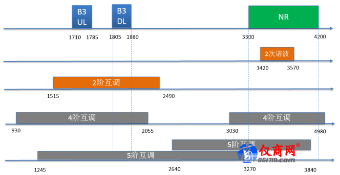 (1)RFIC輸出的B3信號(hào)與正向饋入的3.5 GHz信號(hào)會(huì)進(jìn)行互調(diào),產(chǎn)生二階、四階、五階等互調(diào)產(chǎn)物。