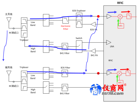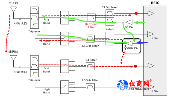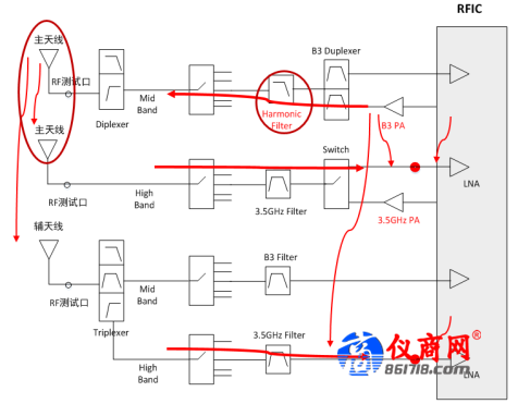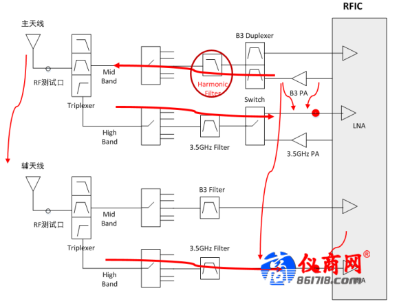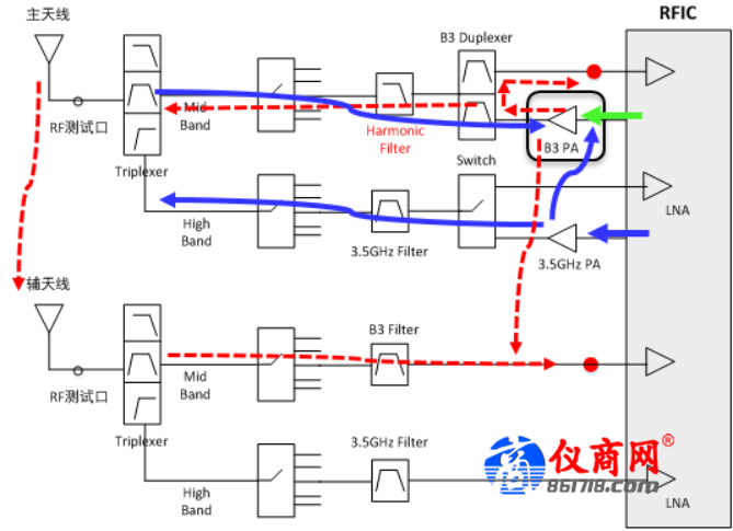一部分諧波經(jīng)過(guò)B3 Duplexer-》Harmonic Filter-》Switch-》Triplexer-》Switch-》3.5 GHz Filter-》Switch-》LNA,之后進(jìn)入RFIC主接收通道,帶來(lái)干擾。