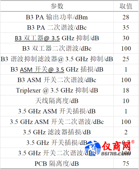 其中,PB3_out為Band3 PA的輸出功率值,P3.5G_out為3.5 GHz PA的輸出功率值,PCBiso為PCB板間隔離,IP2為二階互調(diào)截?cái)鄰?qiáng)度,ISOB3_dup為雙工器在B3的收發(fā)隔離度,IL為鏈路插入損耗,ISOAnt為天線間隔離度。
