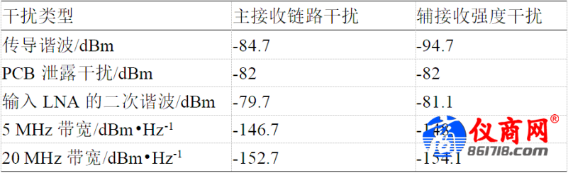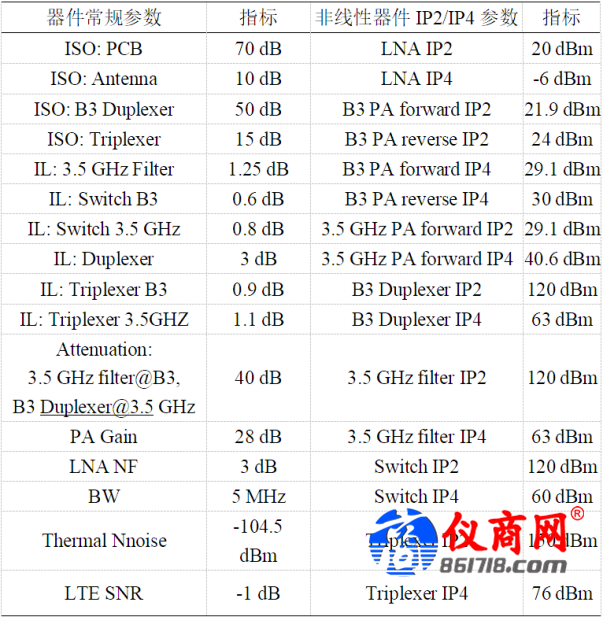 表6列出了B3和3.5 GHz相關(guān)器件互調(diào)計(jì)算參考值。利用這些參數(shù)可計(jì)算互調(diào)干擾的強(qiáng)度以及落入接收頻段帶來(lái)的靈敏度回退情況。
