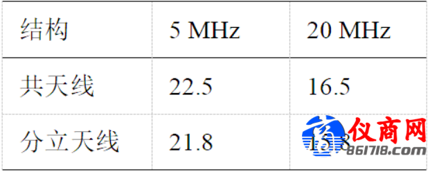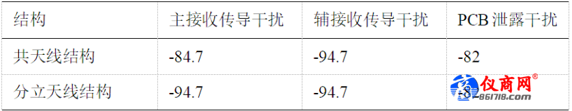 表4對(duì)共天線和獨(dú)立天線兩種架構(gòu)下諧波干擾帶來(lái)的靈敏度回退情況進(jìn)行了匯總。由對(duì)比可見(jiàn),獨(dú)立天線架構(gòu)對(duì)靈敏度的改善僅有0.7 dB,即采用獨(dú)立天線并沒(méi)有明顯地改善靈敏度。