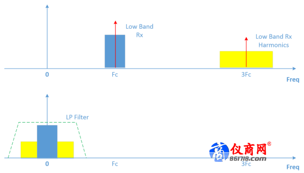 以三次諧波為例,如圖7所示,F(xiàn)c為低頻段下行有用信號(hào)的中心頻點(diǎn),3Fc為高頻段上行發(fā)射信號(hào)的中心頻點(diǎn)。兩個(gè)信號(hào)在接收機(jī)中分別經(jīng)本振的Fc頻率和其三次諧波3Fc頻率混頻,頻譜均被搬移到基帶,RFIC接收機(jī)內(nèi)部的低通濾波器無(wú)法區(qū)分這兩個(gè)信號(hào)從而造成干擾。