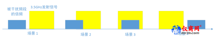 在實(shí)際收發(fā)信號(hào)中,當(dāng)3.5 GHz信號(hào)的發(fā)射頻段與LTE接收頻段的倍頻有交疊即存在發(fā)生諧波混頻干擾的可能。如圖8所示,場(chǎng)景2和場(chǎng)景3將會(huì)發(fā)生諧波混頻[3-4]。