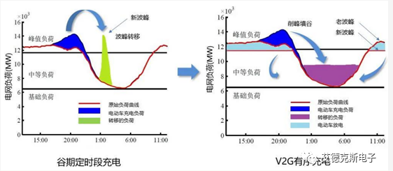 V2G的技術(shù)就是在這種情況下應(yīng)運(yùn)而生的。當(dāng)電動(dòng)車更大規(guī)?;螅妱?dòng)汽車內(nèi)部的電池將可視為一個(gè)龐大的分布式儲(chǔ)能裝置。V2G(Vehicle to Grid)即電能在電網(wǎng)和車輛動(dòng)力電池間的雙向流動(dòng)。通過電網(wǎng)系統(tǒng)的統(tǒng)一控制,在用電低谷期有序協(xié)調(diào)車輛充電,在用電高峰期利用電動(dòng)車存儲(chǔ)的能量像電網(wǎng)釋放能量,將龐大基數(shù)的動(dòng)力電池虛擬成一個(gè)調(diào)峰電廠,實(shí)現(xiàn)削峰填谷,改善電能質(zhì)量,消納可再生能源等功能。