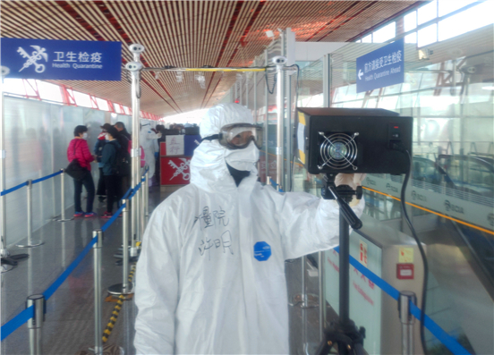 北京市計(jì)量院的青年技術(shù)骨干姚敏和許明在疫情面前沒有畏懼,體現(xiàn)了計(jì)量人勇于擔(dān)當(dāng)、忠于使命的精神。為了不影響海關(guān)衛(wèi)生檢疫對(duì)入境人員的篩查,檢測(cè)人員穿著厚重的防護(hù)服,只能利用航班間隙迅速精準(zhǔn)開展工作。為了能夠更加高效、及時(shí)地確保每臺(tái)設(shè)備量值準(zhǔn)確,避免穿、脫隔離防護(hù)服浪費(fèi)時(shí)間,兩名檢測(cè)人員放棄了午餐和喝水,終于在下午4:00完成了T3-D區(qū)所有海關(guān)入境處14臺(tái)人體溫度篩檢儀的檢測(cè),受到海關(guān)同志們的贊揚(yáng)。