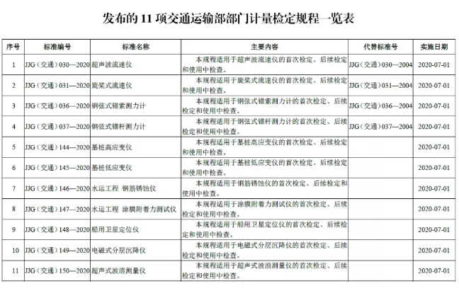 近日,交通運輸部發(fā)布了“交通運輸部關(guān)于發(fā)布《超聲波流速儀》等11項交通運輸部部門計量檢定規(guī)程的公告”,批準(zhǔn)發(fā)布《超聲波流速儀》等11項交通運輸部部門計量檢定規(guī)程,其中,《超聲波流速儀》等4項為修訂類項目(替代了2004年的版本),《基樁高應(yīng)變儀》等7項為新制定項目,自2020年7月1日開始實施。