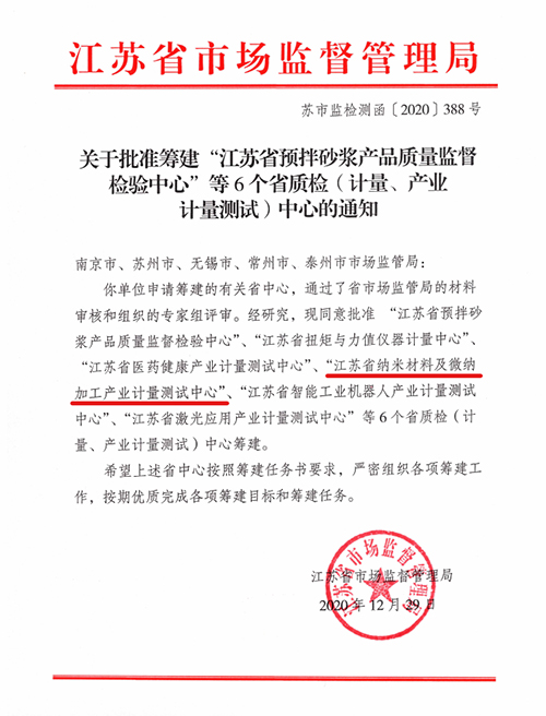2020年12月29日,江蘇省市場監(jiān)督管理局發(fā)文(蘇市監(jiān)檢測函[2020]388號),同意在蘇州市計量測試院的基礎(chǔ)上籌建江蘇省納米材料及微納加工產(chǎn)業(yè)計量測試中心。