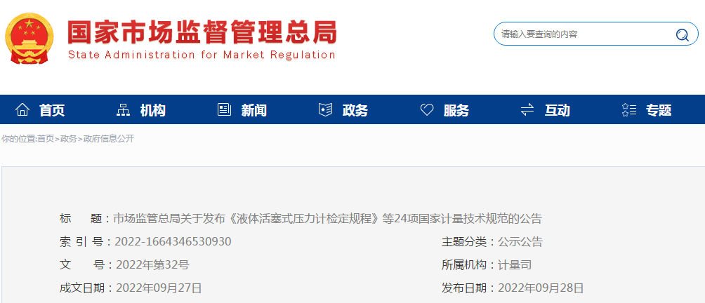 近日,市場(chǎng)監(jiān)管總局發(fā)布2022年第32號(hào)公告,批準(zhǔn)《液體活塞式壓力計(jì)檢定規(guī)程》等24項(xiàng)國(guó)家計(jì)量技術(shù)規(guī)范發(fā)布實(shí)施。