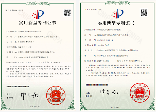 近日,江蘇省計量院電子與電氣計量研究所的兩項(xiàng)國家實(shí)用新型專利《一種用于充電樁測試的測試工裝》與《一種直流充電樁特性測試裝置》獲得授權(quán)。專利主要用于電動汽車充電樁的計量測試領(lǐng)域。