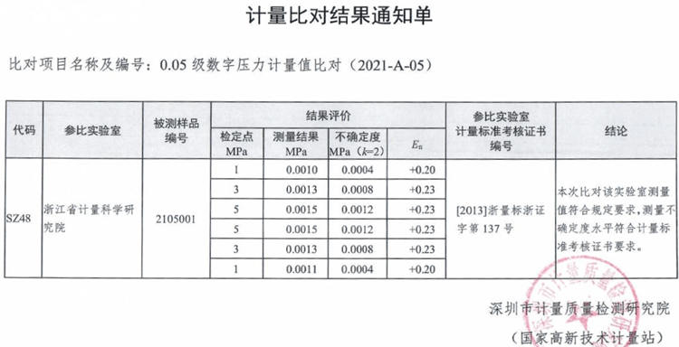 近日,在全國“0.05級數(shù)字壓力計量值比對”中,浙江省計量院取得滿意結(jié)果。比對結(jié)果說明院0.02級活塞式壓力計標準裝置的準確度和可靠性良好。