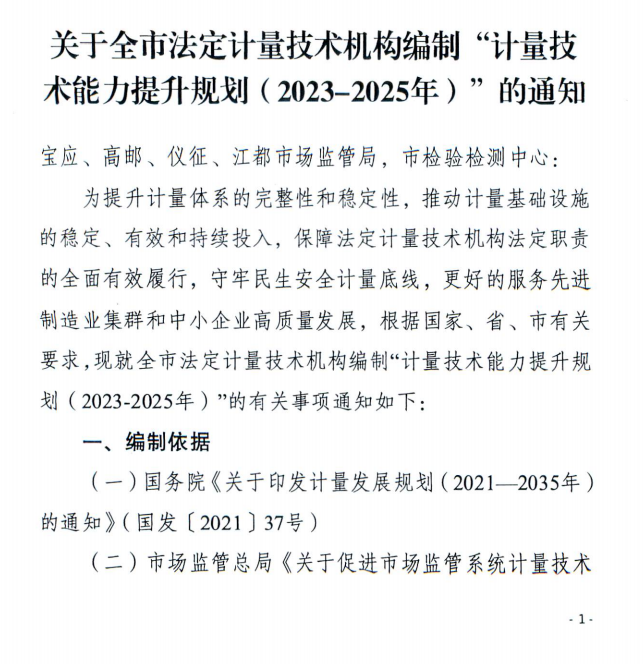 近日,江蘇省揚(yáng)州市市場監(jiān)管局印發(fā)《全市法定計(jì)量技術(shù)機(jī)構(gòu)編制“計(jì)量技術(shù)能力提升規(guī)劃(2023-2025年)”》。
