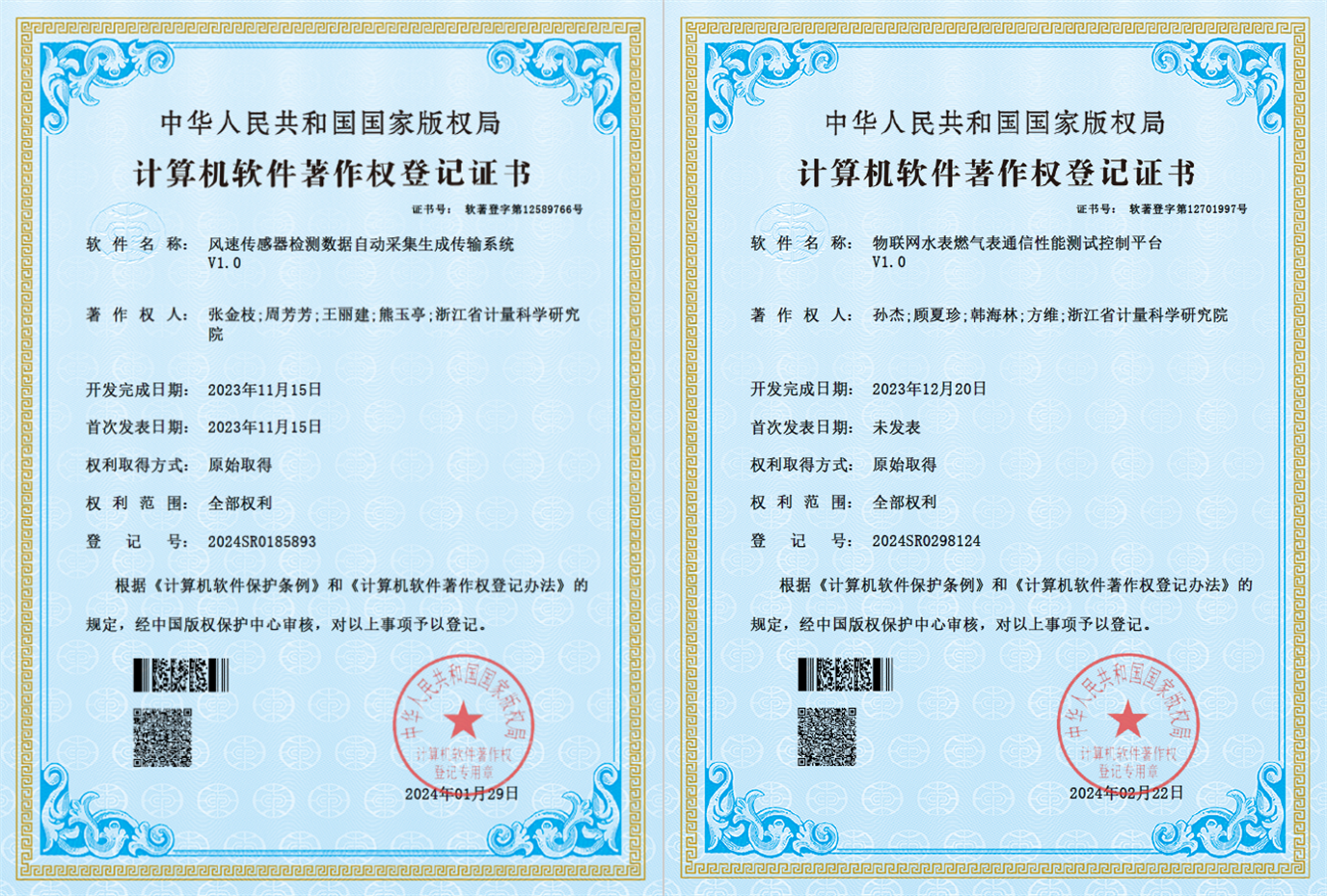 近日,浙江省計(jì)量院設(shè)計(jì)研發(fā)的“風(fēng)速傳感器檢測數(shù)據(jù)自動(dòng)采集生產(chǎn)傳輸系統(tǒng)”“物聯(lián)網(wǎng)水表燃?xì)獗硗ㄐ判阅軠y試控制平臺(tái)”獲國家版權(quán)局著作權(quán)登記證書。