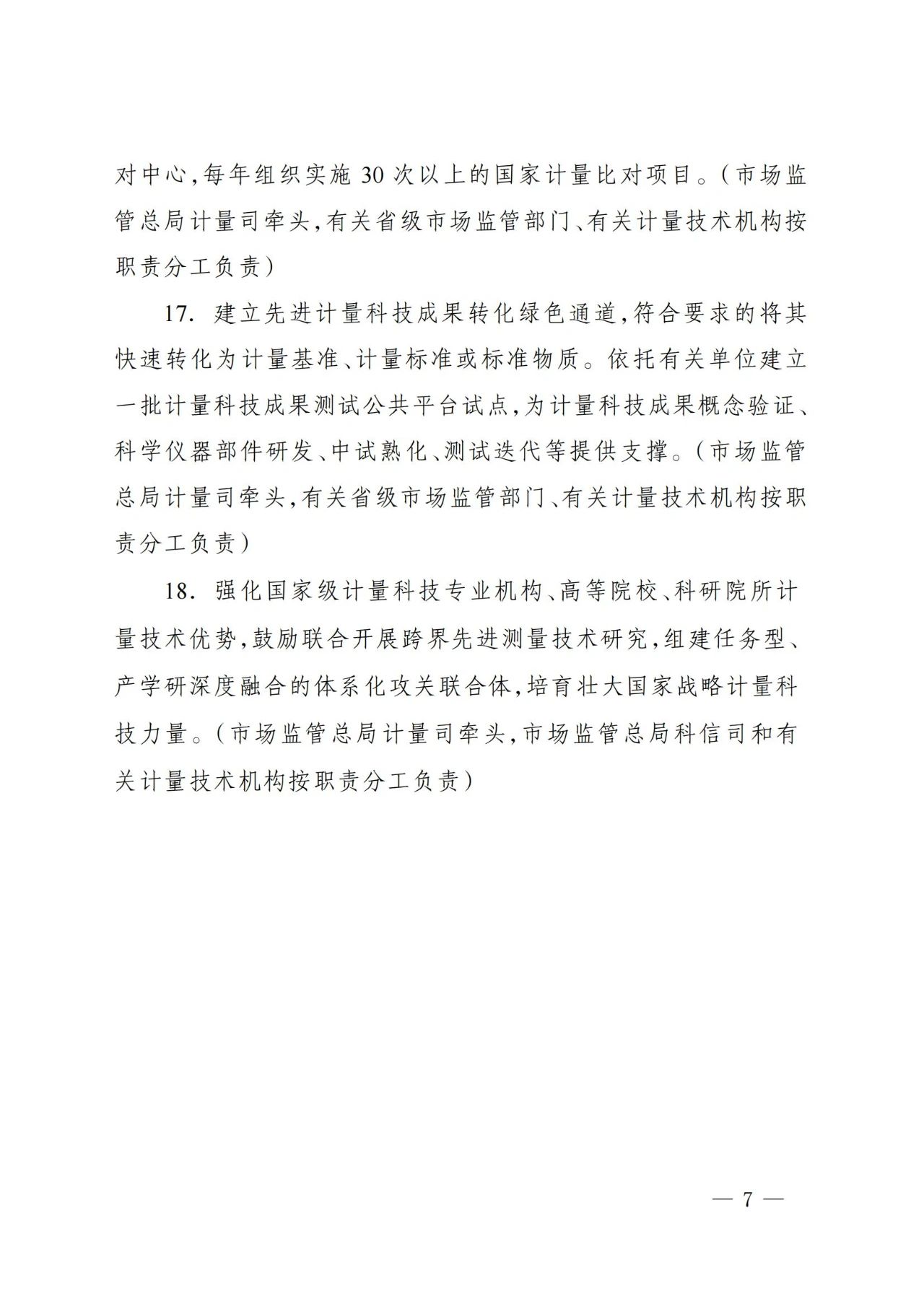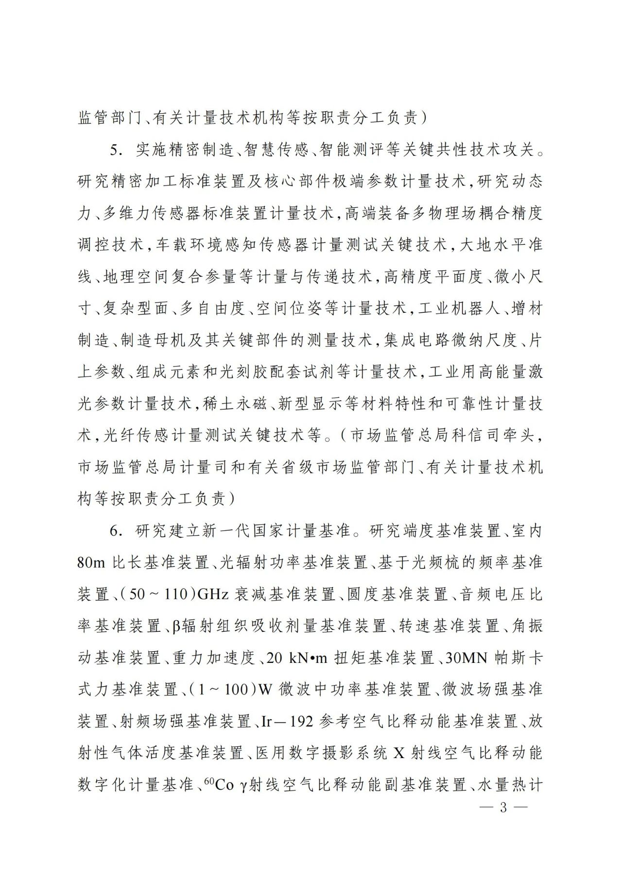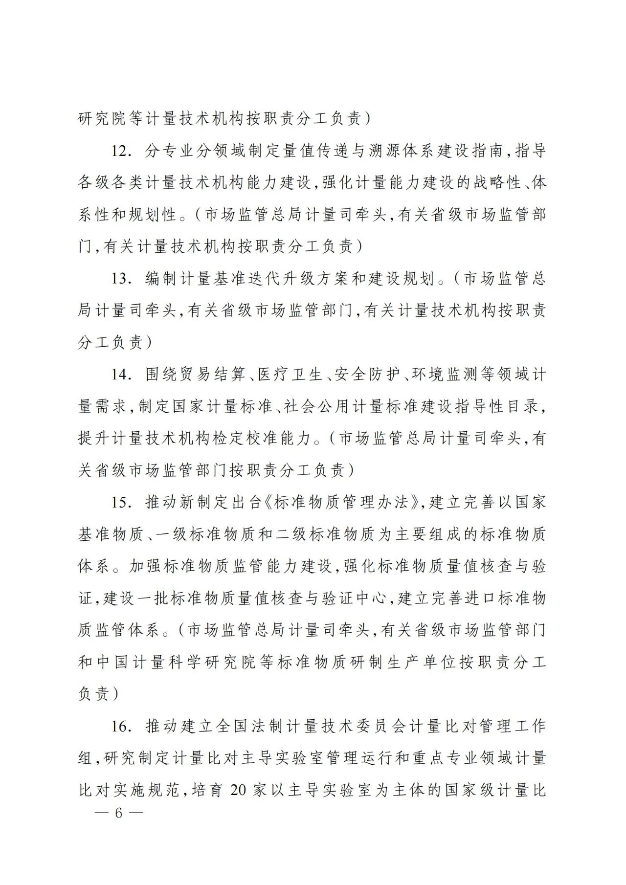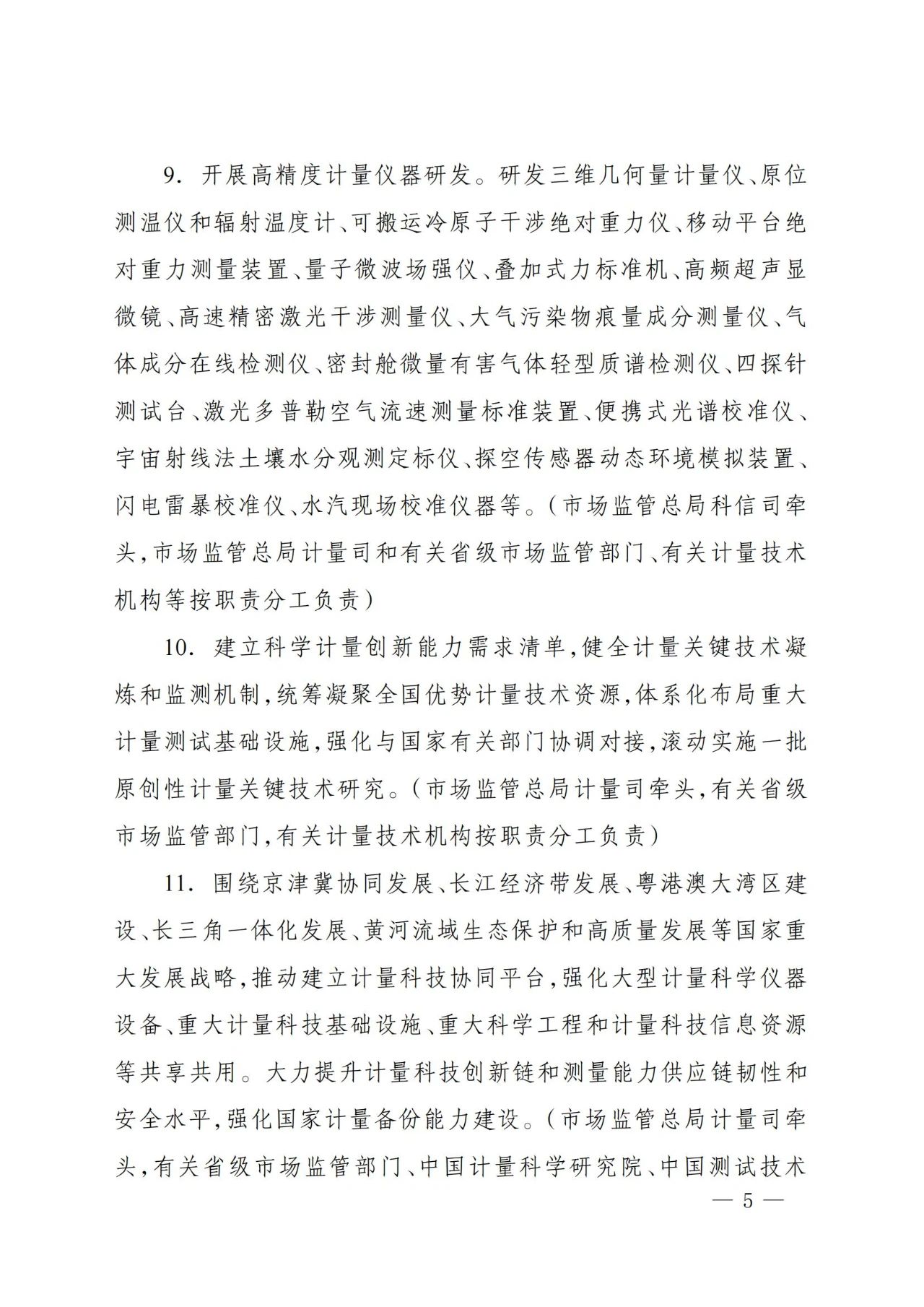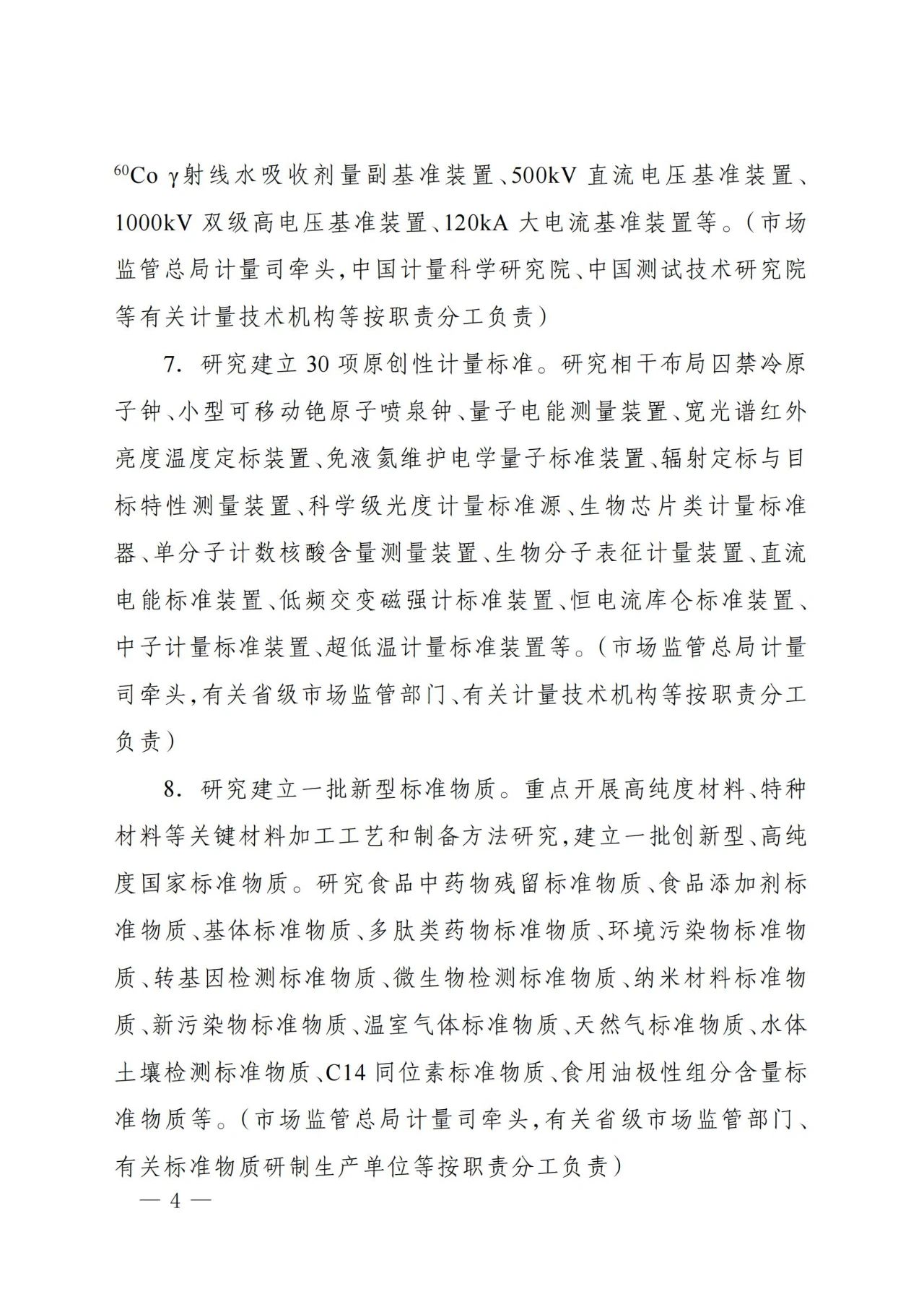 (六)推進(jìn)計(jì)量標(biāo)準(zhǔn)能力建設(shè)。圍繞貿(mào)易結(jié)算、醫(yī)療衛(wèi)生、安全防護(hù)、環(huán)境監(jiān)測(cè)、防災(zāi)減災(zāi)等領(lǐng)域計(jì)量需求,制定國(guó)家計(jì)量標(biāo)準(zhǔn)能力建設(shè)指導(dǎo)目錄,升級(jí)全國(guó)社會(huì)公用計(jì)量標(biāo)準(zhǔn)信息公開(kāi)系統(tǒng),提升計(jì)量技術(shù)機(jī)構(gòu)檢定校準(zhǔn)能力,構(gòu)建量值溯源鏈清晰、布局合理、保障有力、技術(shù)先進(jìn)、服務(wù)便捷的國(guó)家計(jì)量標(biāo)準(zhǔn)、社會(huì)公用計(jì)量標(biāo)準(zhǔn)支撐體系。強(qiáng)化支撐產(chǎn)業(yè)計(jì)量標(biāo)準(zhǔn)能力建設(shè),加快形成計(jì)量技術(shù)到場(chǎng)景應(yīng)用全鏈條貫通的計(jì)量標(biāo)準(zhǔn)形成機(jī)制,加強(qiáng)高端儀器設(shè)備核心器件、核心算法和核心溯源技術(shù)研究,研制一批原創(chuàng)性、高精度計(jì)量標(biāo)準(zhǔn)。