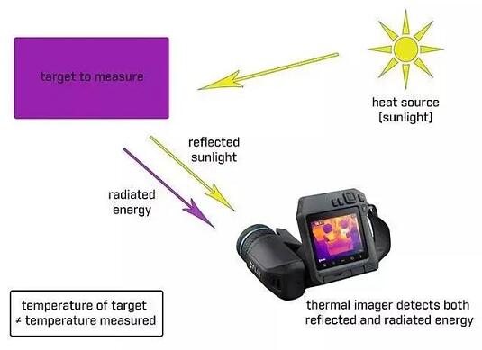反射溫度會(huì)影響熱像儀測(cè)量的表象溫度(除發(fā)射率是影響測(cè)溫結(jié)果的重要補(bǔ)償參數(shù),環(huán)境反射表象溫度對(duì)測(cè)溫結(jié)果影響也是至關(guān)重要的!),如果附近的熱源(如變壓器,電動(dòng)機(jī)或者反射陽(yáng)光中的紅外波段能量)從物體表面反射進(jìn)入熱像儀鏡頭,而被測(cè)物體本身溫度可能很低,但根據(jù)熱像儀顯示的溫度卻可能高得多。