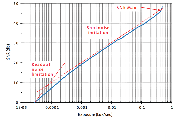 依據(jù)最大SNR點(diǎn)來評(píng)判sensor有以偏概全的問題。根據(jù)需要,用戶可以選取特定曝光條件Exposure對(duì)應(yīng)的SNR大小來評(píng)判低照噪聲,SNR越大越好;也可以限定SNR為某個(gè)固定值,例如SNR=5時(shí),用此時(shí)需要的曝光條件Exposure值大小來評(píng)判低照噪聲,Exposure值越小意味著達(dá)到同等SNR時(shí)需要的光照資源越少,sensor的低照性能越好。