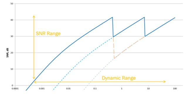 圖2顯示的是普通sensor的SNR,是單調(diào)遞增的曲線。汽車上使用的CMOS sensor,為了匹配全天候應(yīng)用場(chǎng)景,需要很高的動(dòng)態(tài)范圍HDR,HDR常用方法是改變sensor的靈敏度,對(duì)環(huán)境的不同亮度分別采樣,再把多次采樣的圖像幀映射到標(biāo)準(zhǔn)化的線性數(shù)據(jù)空間,最后從不同靈敏度幀中選取合適像素,拼成一張完整的圖像幀,參見《車用圖像傳感器參數(shù)小議——?jiǎng)討B(tài)范圍》。