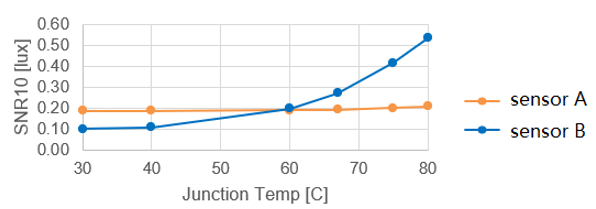 以溫度影響為例,圖5是SNR=10時(shí)需要的Exposure值隨sensor內(nèi)部溫度升高的變化趨勢(shì),我們可以看到,不同sensor對(duì)溫漂的敏感度是不一樣的,這兩個(gè)sensor的SNR曝光值在60°C時(shí)發(fā)生交叉,意味著在室溫25℃和高溫80℃分別評(píng)估時(shí),得出的SNR結(jié)論截然相反。