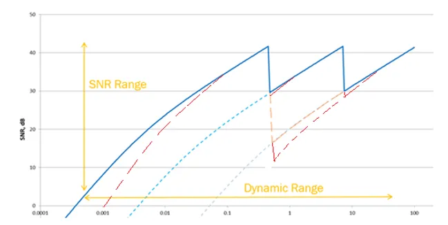 sensor的靈敏度變化,對(duì)應(yīng)于坐標(biāo)系中的SNR線移動(dòng)到不同的位置,最終HDR圖像的SNR曲線演變成多條SNR曲線的擬合結(jié)果,例如圖3的藍(lán)線,它不再是一條單調(diào)遞增曲線,除了低照SNR會(huì)很小以外,高亮區(qū)間還會(huì)出現(xiàn)多個(gè)局部極小值,當(dāng)工作點(diǎn)落在SNR跌落區(qū)間時(shí),即便此時(shí)環(huán)境很亮,噪聲也會(huì)惡化。